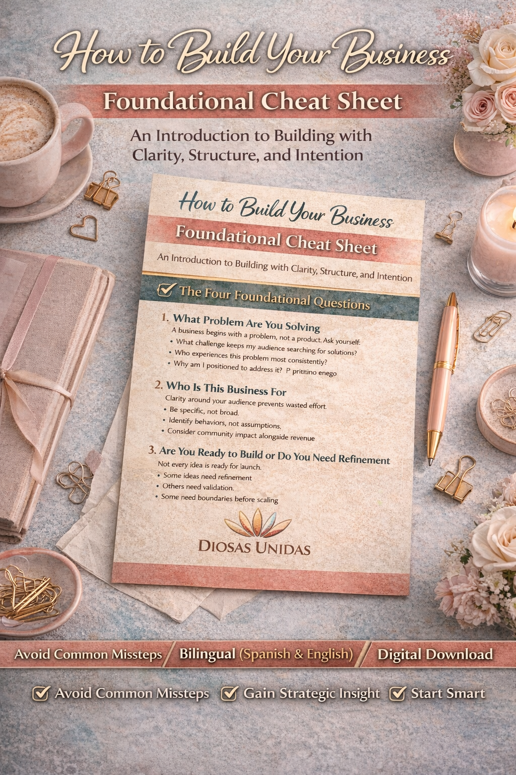 This cheat sheet is designed as a strategic introduction for individuals exploring entrepreneurship or formalizing an early-stage business idea. It helps you clarify what you are building, why it matters, and what foundational decisions must be made before investing time, money, or energy into execution. This resource is intentionally introductory and serves as a gateway to deeper learning, guided workbooks, and customized support offered through Diosas Unidas.